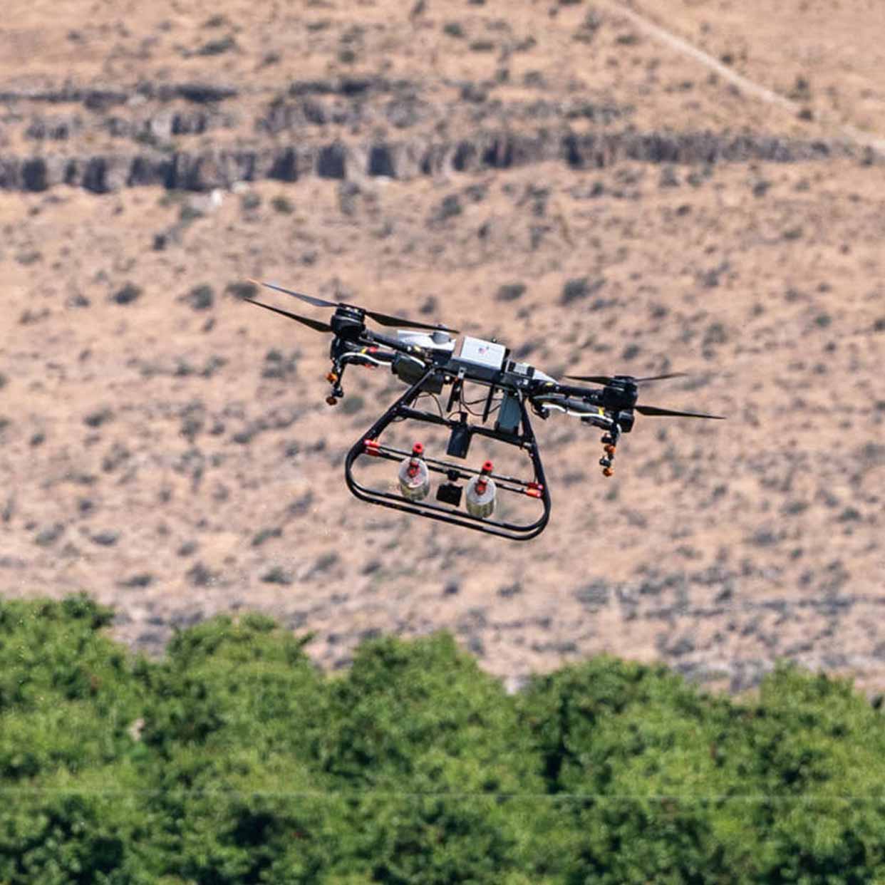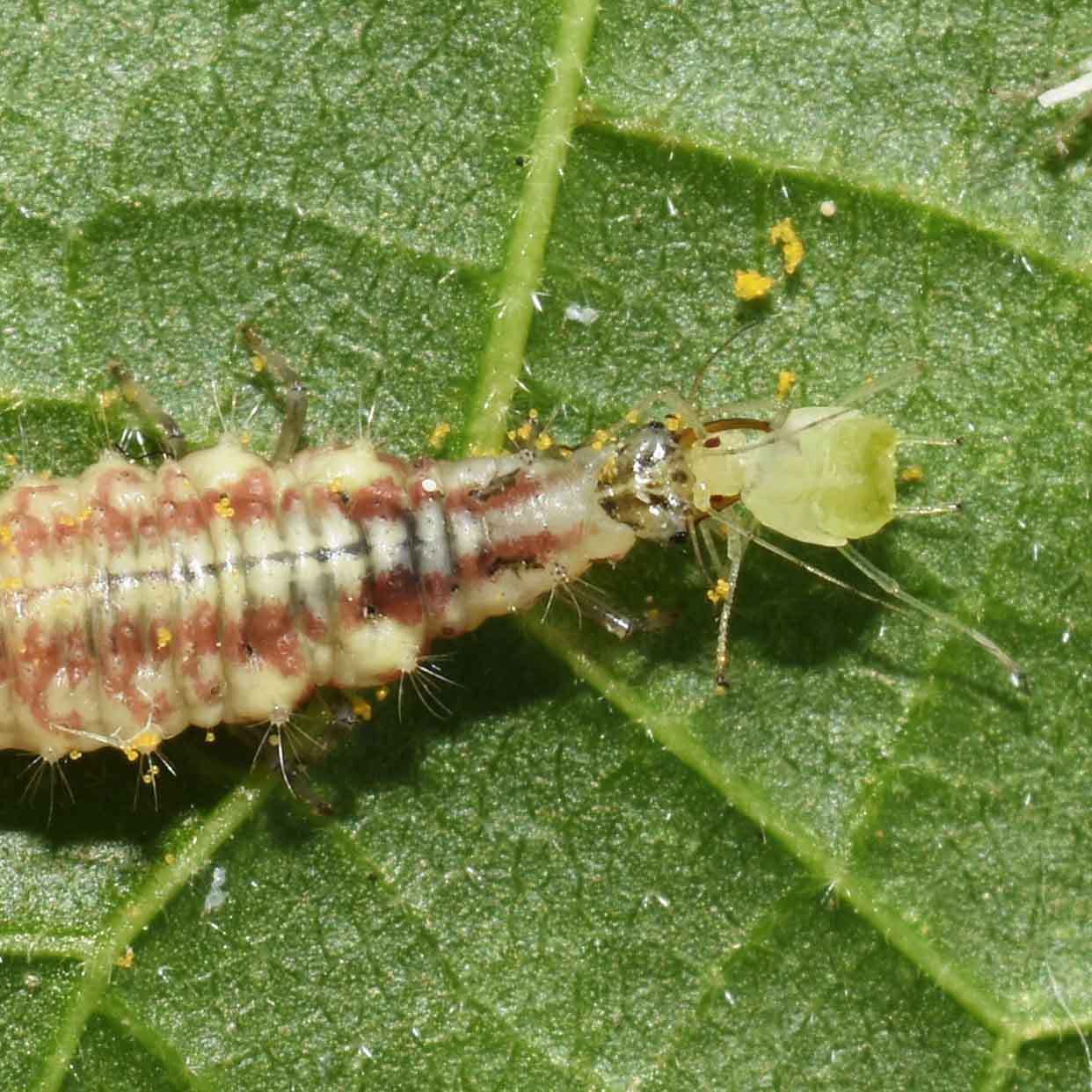Lacewings are another predator bug that we'll deploy as part of our IPM practices. The larva of these flying insects can be dropped by a drone and are attracted to the odors emanating from trees with aphid "hot spots." Once the beneficial bugs have eaten all of the aphids in the orchard, they'll move on to other farms in the area or nearby trees and forage, always on the hunt for tasty pests.